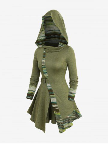 Stripes Print Patchwork Asymmetrical Long Sleeves Hooded Top - Deep Green - Xxl